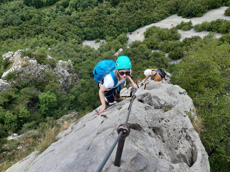 V sredo, 4. 8. 2021 smo se Boris, Renato in jaz odpravili v Vipavo na vse bolj obiskano ferato, po kateri smo se povzpeli na Gradiško Turo. Zame je bila to prva taka pot in lahko priznam, da so se mi roke kar potile. Malo od vročine, malo pa tudi od strahu in pričakovanja. K sreči smo v nizu nevihtnih dni ulovili lepo vreme, zato je dežnik v nahrbtniku poskrbel le za dodatno utež. Ker smo se iz Idrije odpravili že zgodaj, smo si najprej privoščili kavo pri Bojani v Kampu Tura, nato pa se podali v skalo. Boris naju je na začetku seznanil s potrebno opremo in njeno pravilno uporabo, kako varovati oziroma pomagati soplezalcu na težjih odsekih, ter nama dal napotke za lažje ter varno vpenjanje. Vzpon smo nato začeli po lažji Furlanovi poti. Ta se je meni zdela res prijetna, z izjemnimi razgledi na Vipavsko dolino in tudi za plezanje dokaj enostavna. Kar prehitro jo je bilo konec. Na koncu Furlanove poti se sicer lahko zapusti ferato in brez varovanja nadaljuje po enostavni označeni poti do vrha, mi pa smo s plezanjem nadaljevali po sosednji Otmarjevi poti. Ta velja za težjo, predvsem zaradi kratkega previsa na začetku, je pa tudi malo daljša. Ferata nas je pripeljala tik pod vrh 793 m visoke Gradiške Ture, kjer smo se še vpisali v planinsko knjižico, nato pa se peš vrnili v dolino na zasluženo kosilo. Lahko rečem, da je bilo moje prvo srečanje s ferato kar uspešno in definitivno ne zadnje. Se že veselim novih vzponov.