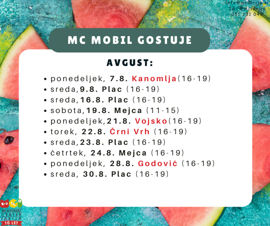 MC mobil bo med 24. 7. in 6. 8. na dopustu, da si nabere nove energije za avgustovske pustolovščine - ti pa si lahko že sedaj pogledaš, kje ga v AVGUSTU najdeš ;)